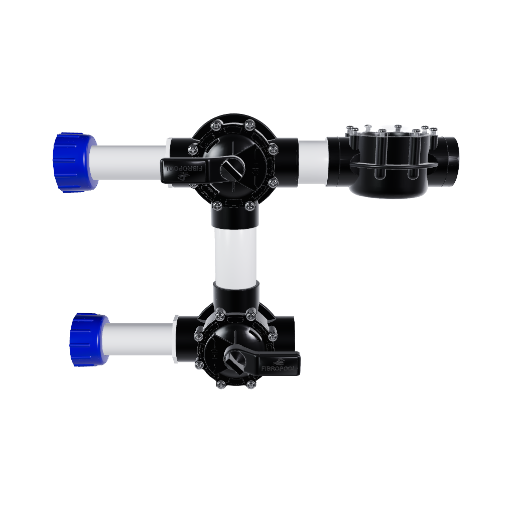 Purpose-built bypass for the FibroPool FH255 heat pump. This model uses compression fittings instead of standard 1.5" threaded unions and includes a check valve for safe operation and winterization.